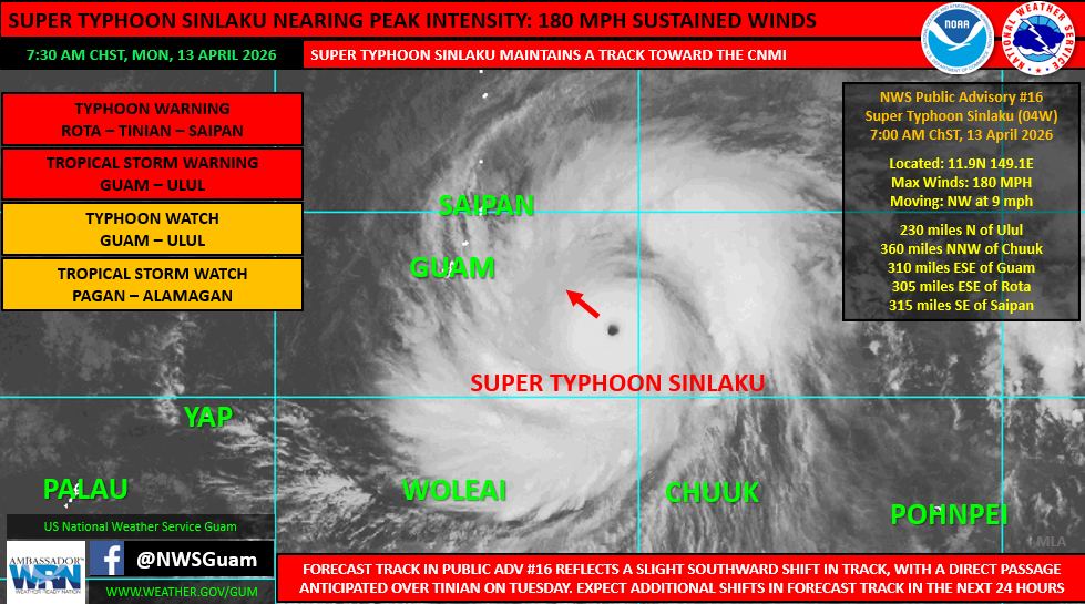 Super Typhoon Sinlaku continued its rapid intensification overnight, reaching an incredible 180 mph maximum sustained winds early this morning, according to the National Weather Service.